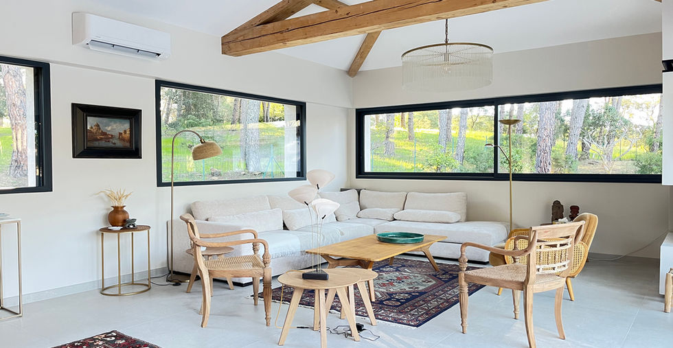 • Grand espace de vie lumineux, dessiné par les larges ouvertures vitrées avec vue sur la pinède et la piscine ;